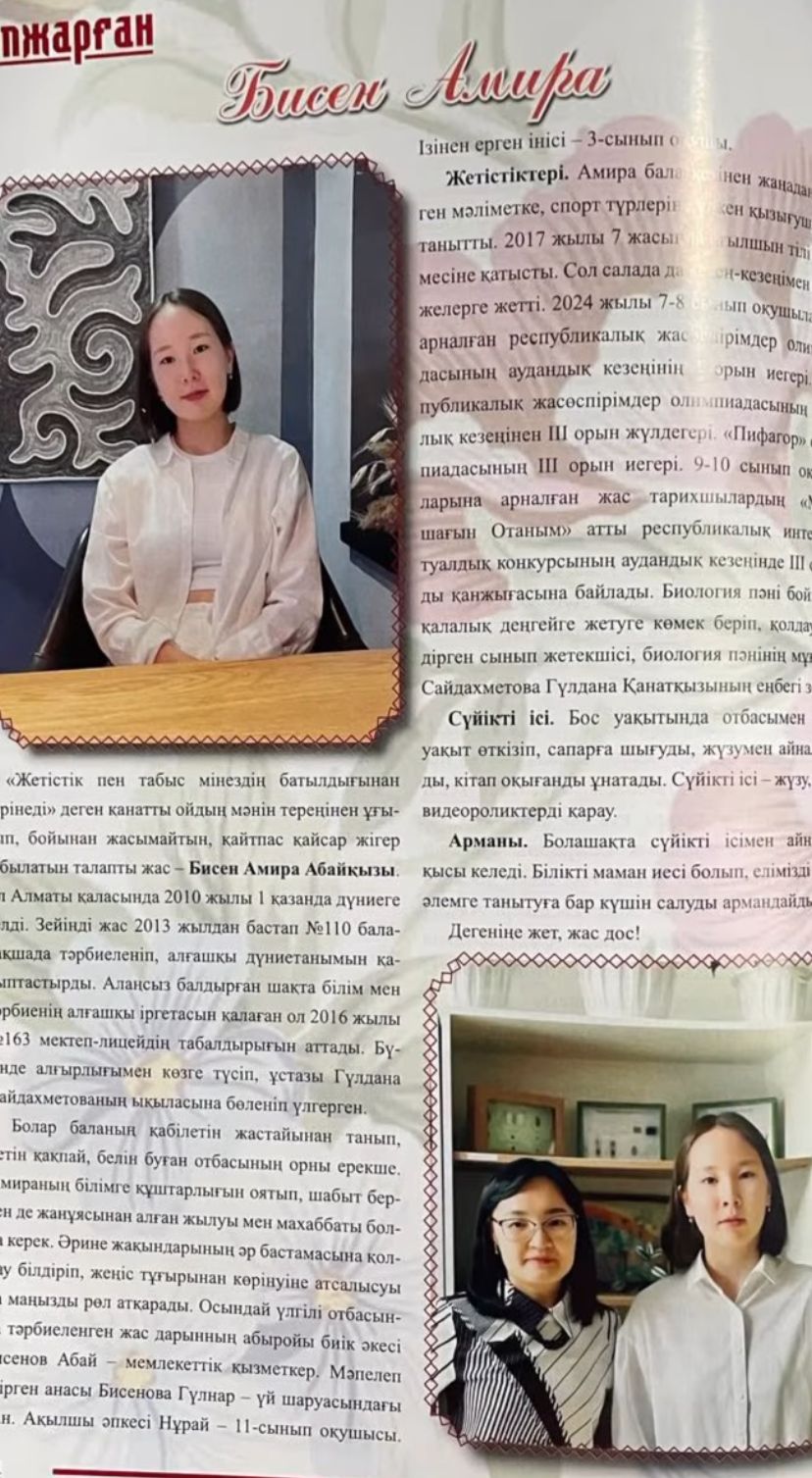 9 "А" сынып оқушысы Бисен Амира еліміздің ізденімпаз жастарына үлгі болған 100 дарынды балалар қатарынан табылып, республикалық "Education" баспа үйін