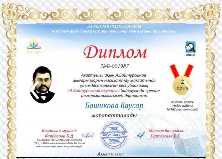 «IZDENIS» Республикалық оқытушылар мен оқушылар порталының ұйымдастыруымен өткен ағартушы ақын Ахмет Байтұрсынов шығармаларын насихаттау мақсатында ұйымдастырылған республикалық «А.Байтұрсынов оқулары» байқауында ерекше шығармашылығымен дараланған, жүлделі 2 орынды №163 мектеп-лицейдің 5 «А» сынып оқушысы Башикова Каусар Талғатқызы иеленді.