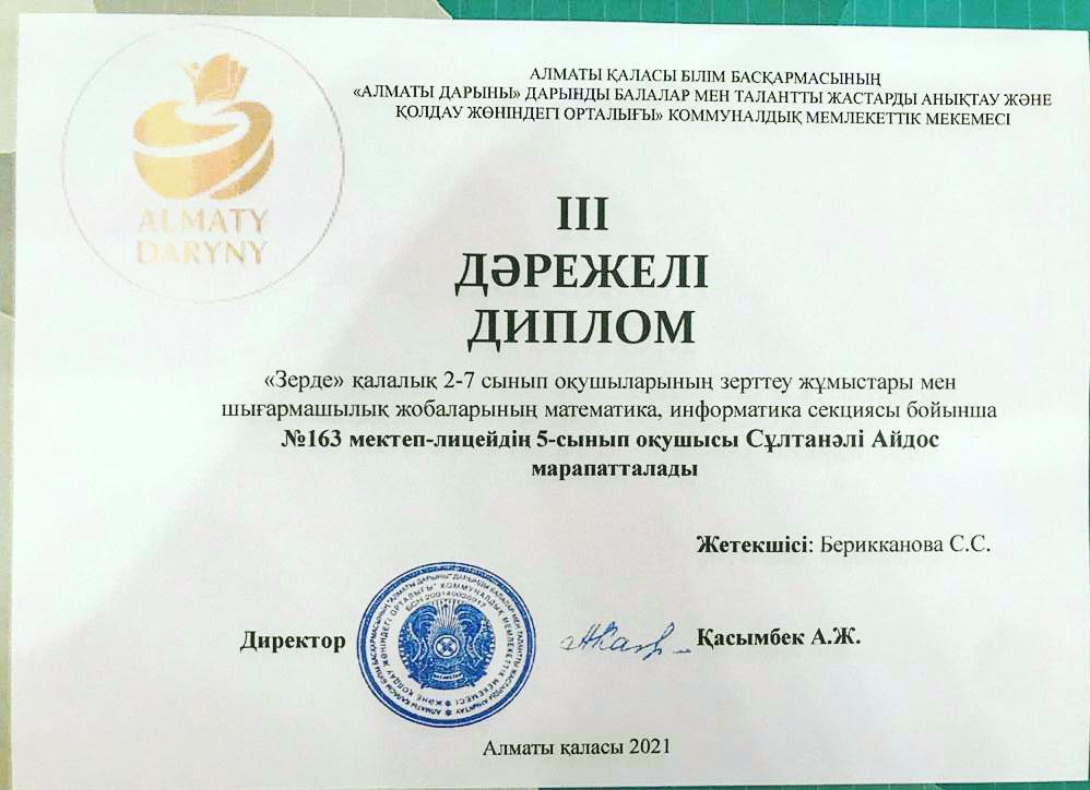 Алматы қаласы Білім басқармасының «Алматы дарыны» дарынды балалар мен талантты жастарды анықтау және қолдау жөніндегі орталығының» ұйымдастыруымен өткен «Зерде» қалалық 2-7-сынып оқушыларының зерттеу жұмыстары мен шығармашылық жобаларының математика, информатика секциясы бойынша №163 мектеп-лицейдің 5 «Ә» сынып оқушысы Сұлтанәлі Айдос ІІІ дәрежелі диплом иегері атанды.