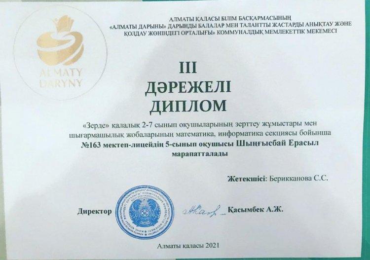 Алматы қаласы Білім басқармасының «Алматы дарыны» дарынды балалар мен талантты жастарды анықтау және қолдау жөніндегі орталығының» ұйымдастыруымен өткен «Зерде» қалалық 2-7-сынып оқушыларының зерттеу жұмыстары мен шығармашылық жобаларының математика, информатика секциясы бойынша №163 мектеп-лицейдің 5 «Ә» сынып оқушысы Шыңғысбай Ерасыл ІІІ дәрежелі диплом иегері атанды.