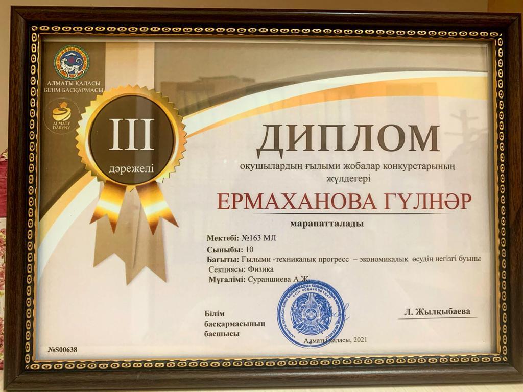 Алматы қаласы Білім басқармасының «ALMATY DARYNY» дарынды балалар мен талантты жастарды анықтау және қолдау жөніндегі орталығының» ұйымдастыруымен өткен оқушылардың ғылыми жобалар конкурсында «Физика» пәнінен «Ғылыми - текникалық прогресс-экономикалық өсудің негізігі буыны» бағытында №163 мектеп-лицейдің 10 сынып оқушысы Ермаханова Гүлнәр жүлделі ІІІ дәрежелі диплом иегері атанды.