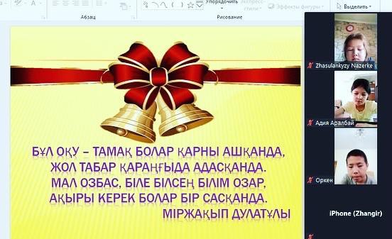 Алматы қаласы,Медеу ауданы №163 мектеп-лицейінде 1-11-сынып оқушыларына “Сыңғырла соңғы қоңырау” атты сынып сағаттары еліміздегі эпидемиологиялық жағдайға байланысты онлайн зум платформасымен өтті.