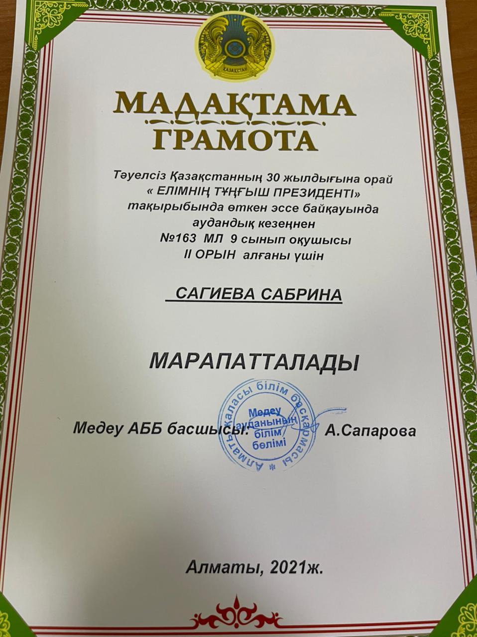 📌Тәуелсіз Қазақстанның 30 жылдығына орай “Елімнің Тұңғыш Президенті”тақырыбында өткен эссе байқауында аудандық кезеңнен мектебіміздің 9-сынып оқушысы Сагиева Сабрина жүлделі 2-орынды иеленді!