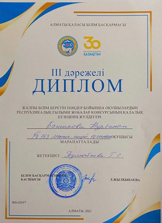📌Алматы қаласы Білім басқармасының жалпы білім беретін пәндер бойынша оқушылардың республикалық ғылыми жобалар конкурсының қалалық кезеңінен мектебіміздің 10-сынып оқушысы Башикова Нұрғаным 3-дәрежелі дипломмен марапатталды!