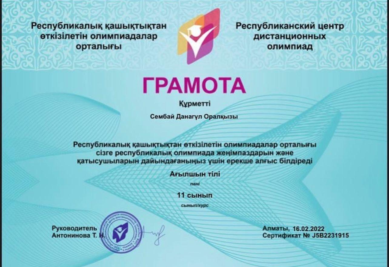 Республикалық қашықтықтан өткізілетін олимпиадалар орталығы республикалық олимпиада нәтижесінде ағылшын тілі пәні бойынша олимпиадаға дайындаған Сембай Данагүл Оралқызына алғыс білдірді!