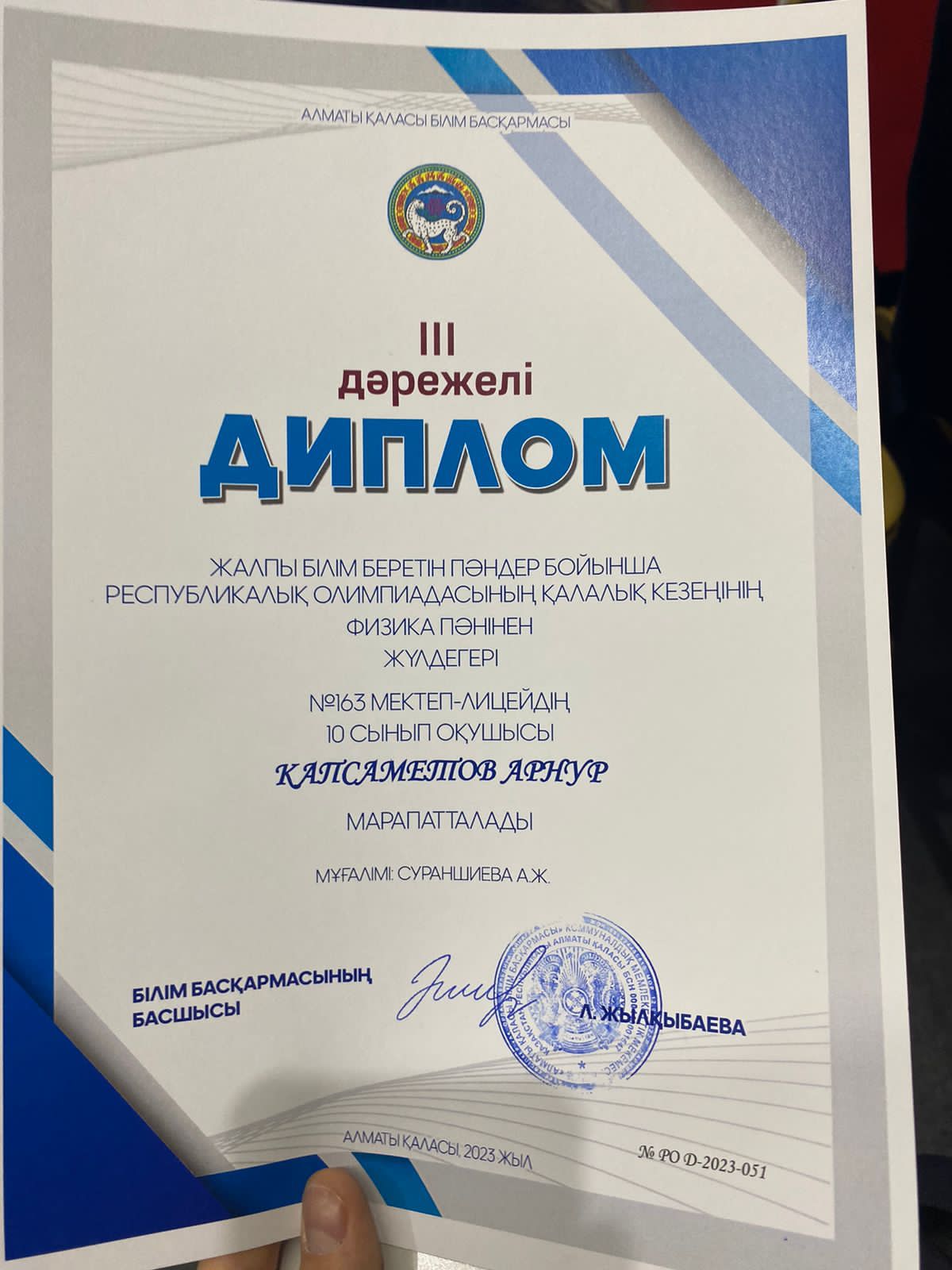 Школа-лицей №163. Медеу ауданы » Ақпарат » Жалпы білім беретін пәндер бойынша Республикалық олипиаданың қалалық кезеңінің физика пәнінен мектебіміздің 10 - сынып оқушысы Қапсаметов Арнур lll о