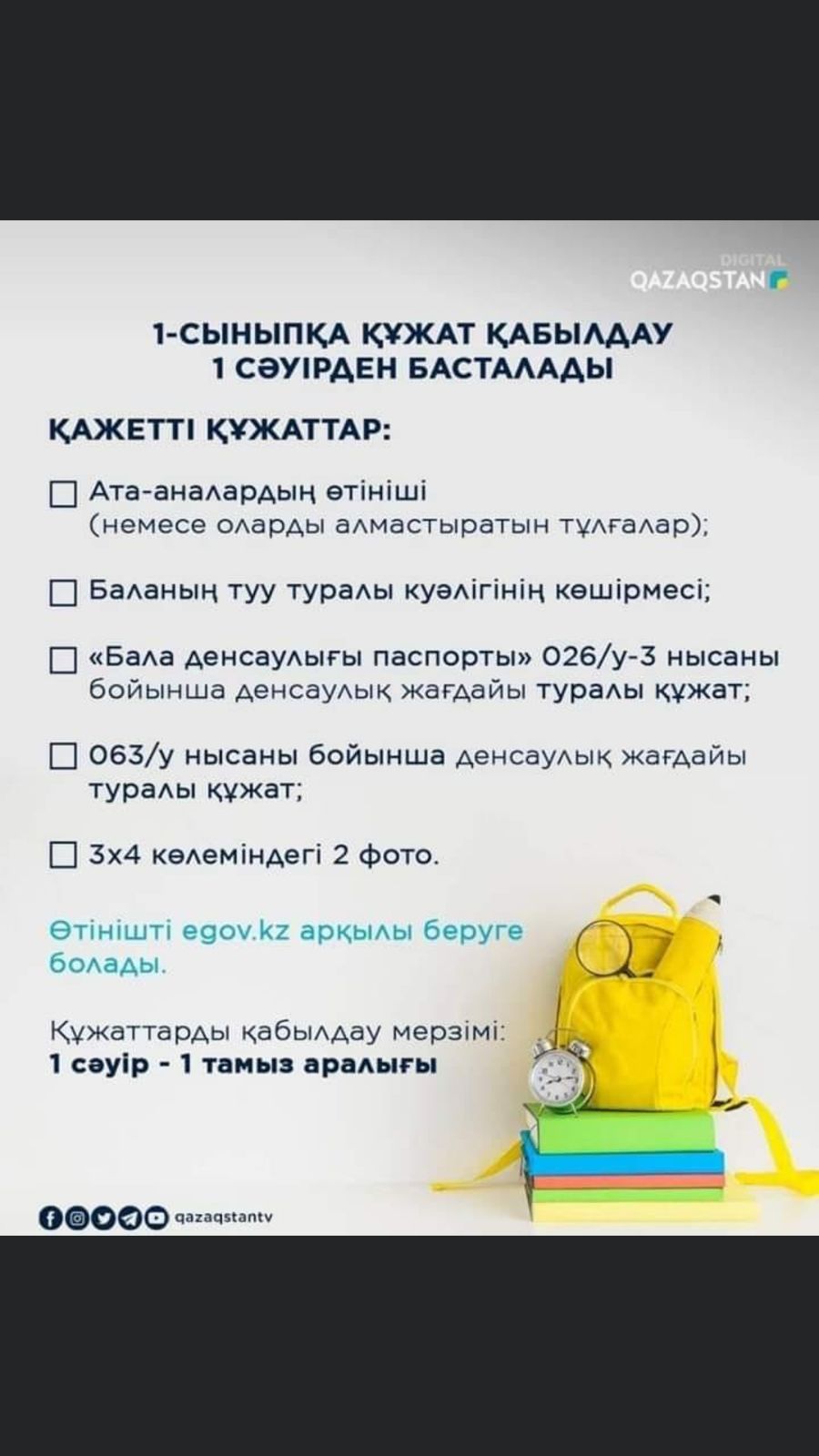 Бірінші сынып оқушыларының құжаттарын қабылдау 1 сәуірде басталып, 1 тамызға дейін жалғасады.