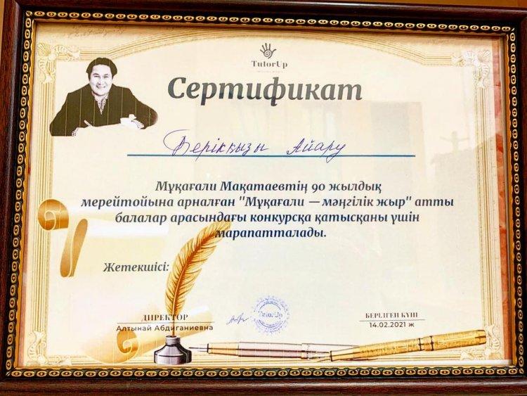 Мұқағали Мақатаевтың 90 жылдық мерейтойына арналған «Мұқағли-мәңгілік жыр» атты балалар арасындағы конкурсқа қатысқаны үшін №163 мектеп-лицейдің 2 «Ә» сынып оқушылары Берікқызы Айару және Берікқызы Айзере марапатталады.