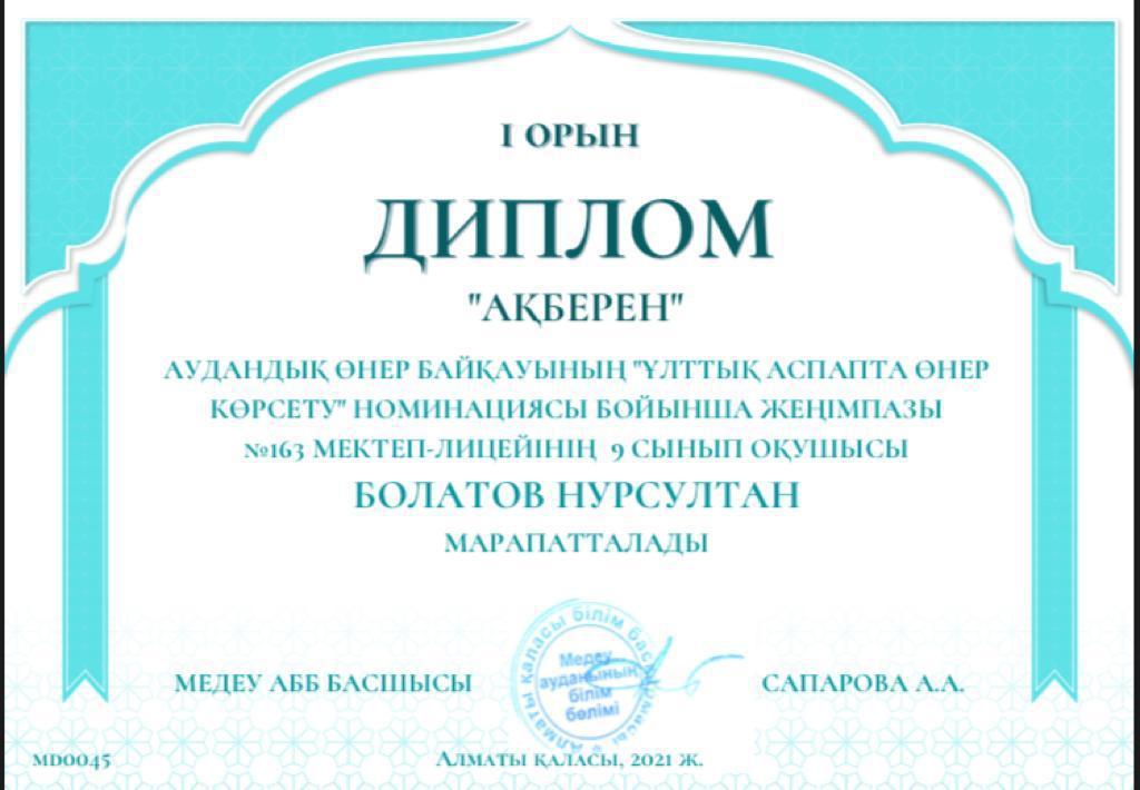 🥇🏆🏅Алматы қаласы, Медеу аудандық “Ақберен” өнер байқауының “Ұлттық аспапта өнер көрсету” номинациясы бойынша 9 “Б” сынып оқушысы Болатов Нұрсұлтан жүлделі І орын иегері атанды