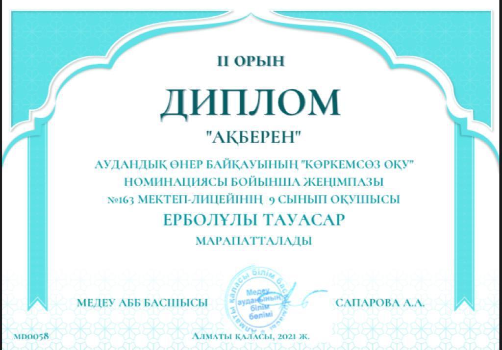 🥇🏆🏅Алматы қаласы, Медеу аудандық “Ақберен” өнер байқауының “Көркем сөз оқу” номинациясы бойынша 9 “Б” сынып оқушысы Ерболұлы Тауасар жүлделі ІІ орын иегері атанды