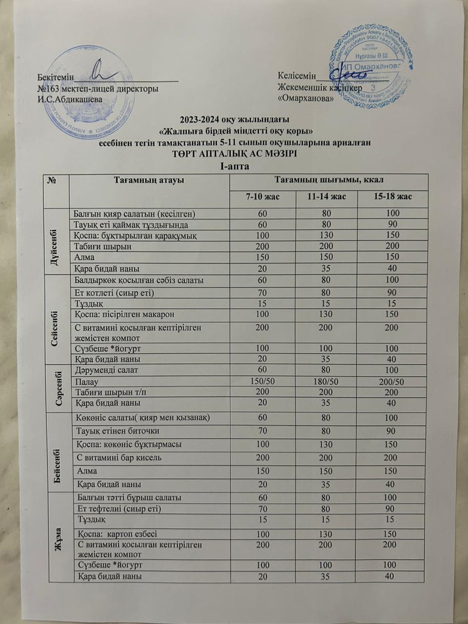 » » » Күнделікті тегін тамақтанатын оқушылардың ас мәзірі (04.09.2023)